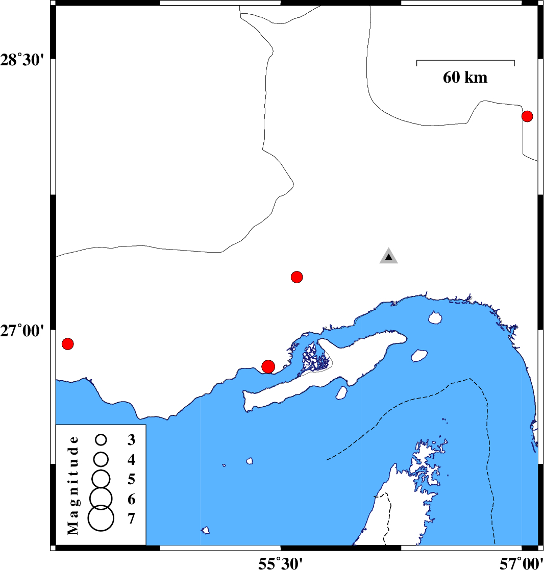 | 2022/10/29 | 12:34:22.8 | 16:04:22.8 | 27.292 | 55.6 | 12 | ML3.2 | Hormozgan Province, 68 km North-West of Bandar-e abbas | ||