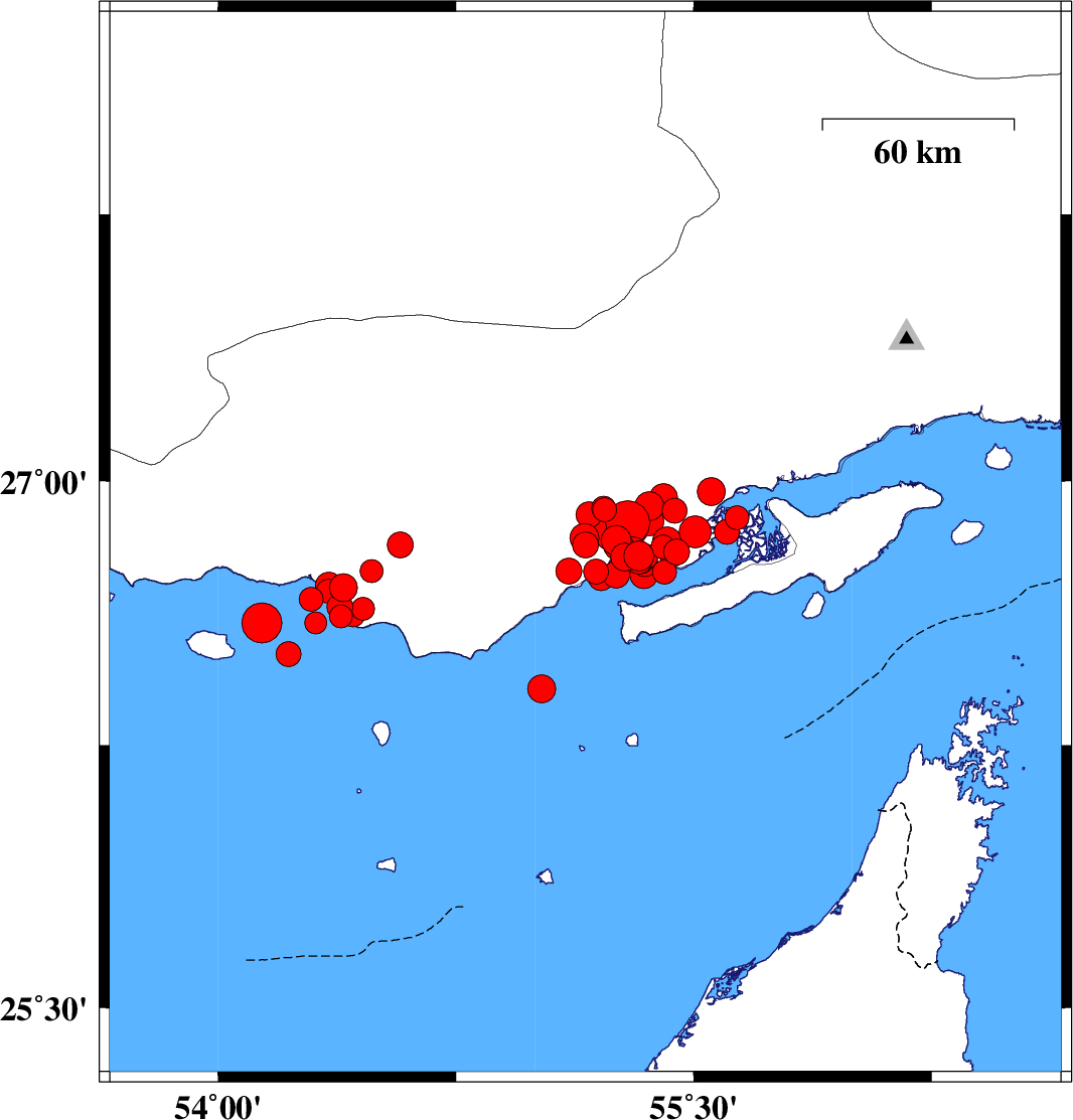 2022/07/01 21:53:22.8 02:23:22.8 26.73555.34312 ML3.9 Persian Gulf, 54 km North-East of Bandar-e lengeh