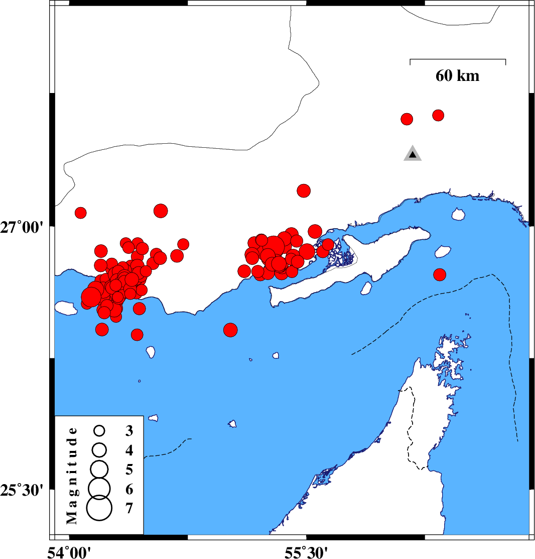 2022/06/18 16:44:47.5 21:14:47.5 26.64254.16612 ML4.7 Persian Gulf, 65 km South-West of Bastak
