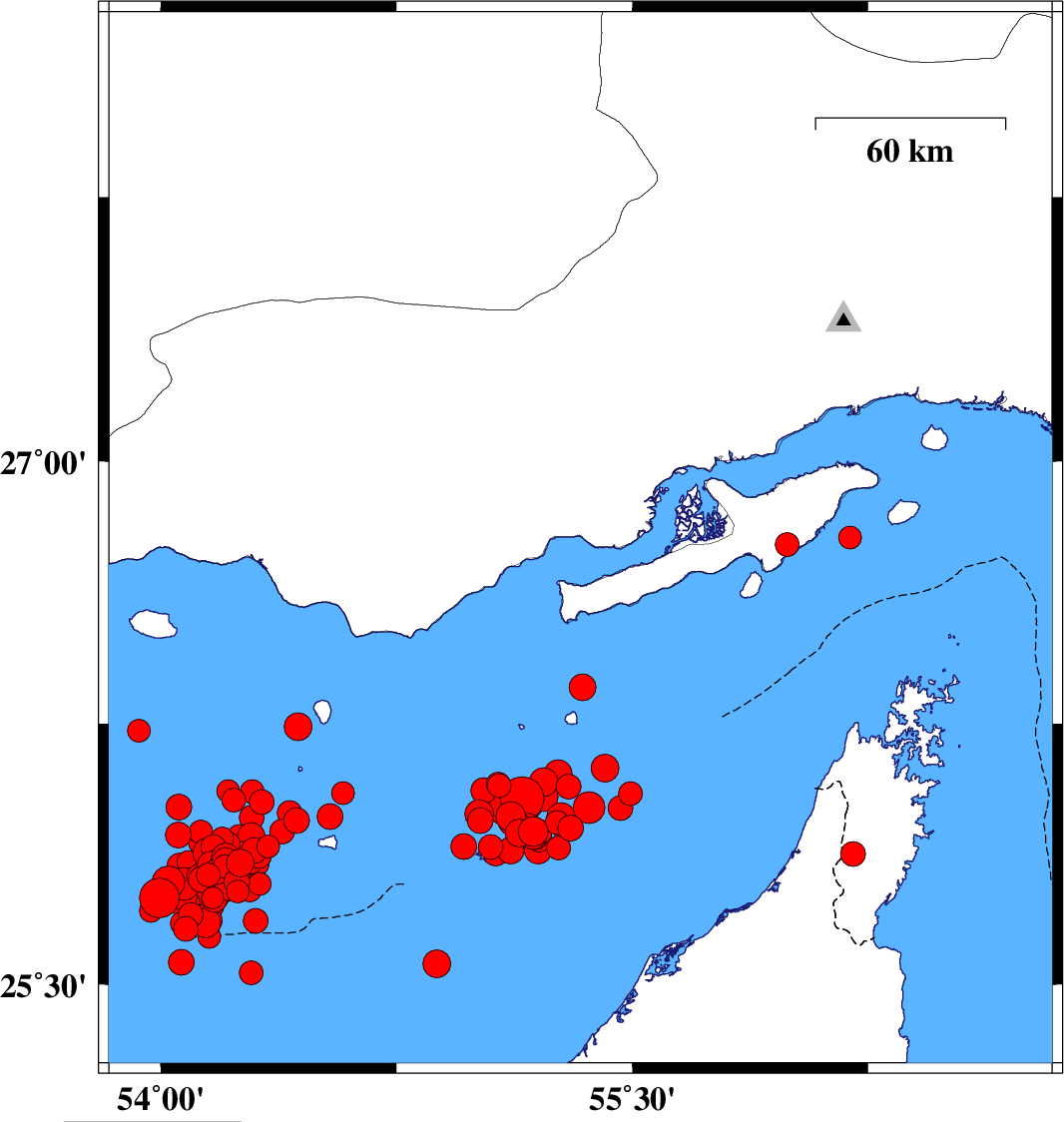 2022/06/15 18:07:49.5 22:37:49.5 26.53454.29512 ML3.8 Persian Gulf, 55 km -West of Bandar-e lengeh