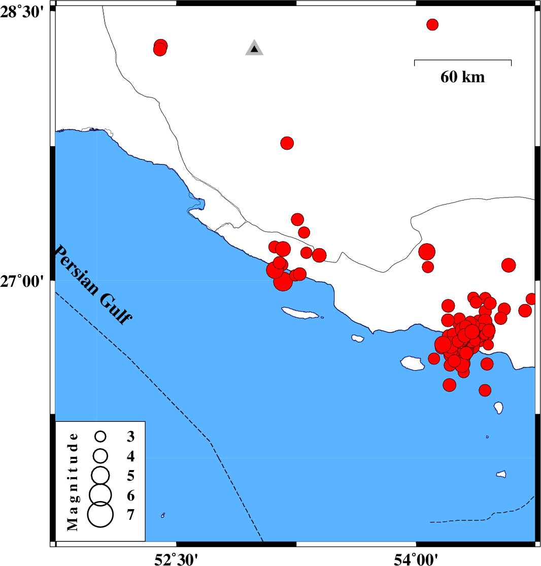 2022/06/16 00:26:04.8 04:56:04.8 26.77354.4310 ML4 Hormozgan Province, 48 km South of Bastak