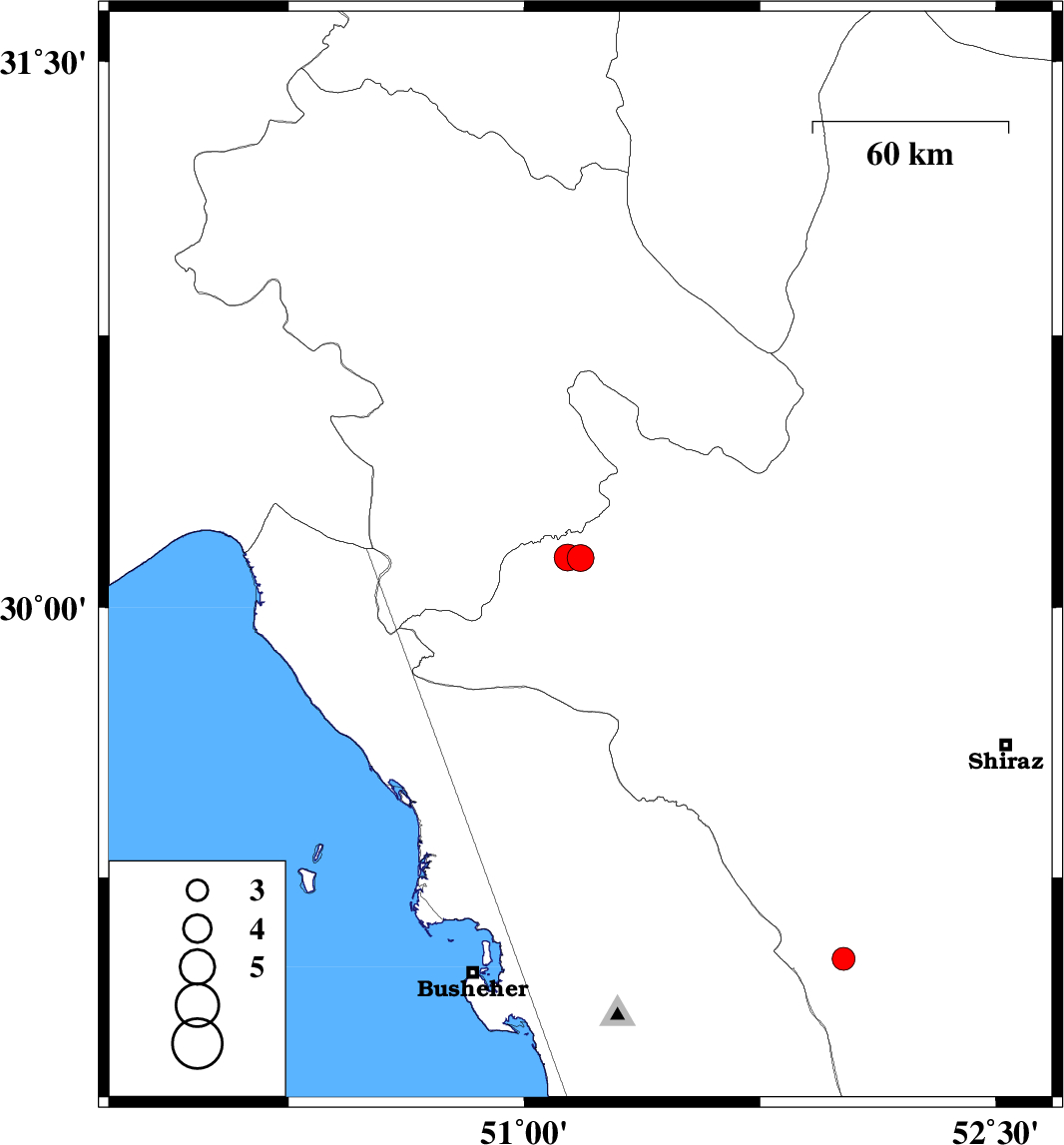 | 2022/12/02 | 02:00:48.6 | 05:30:48.6 | 30.138 | 51.138 | 12 | ML3.8 | Fars Province, 37 km -West of Nurabad | ||