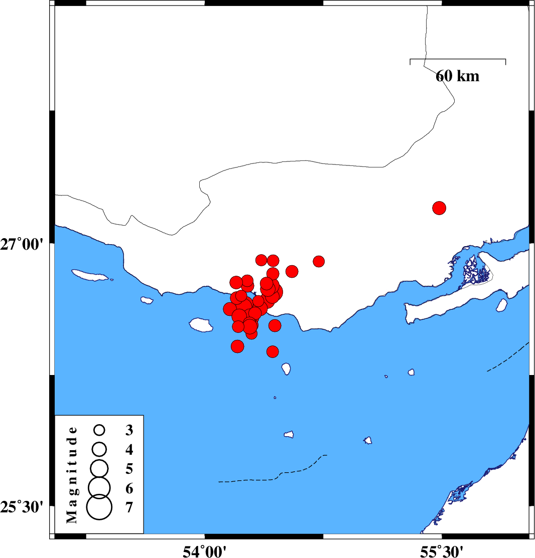 2022/06/15 05:55:00.6 10:25:00.6 26.63854.24715 ML4.6 Persian Gulf, 63 km South-West of Bastak