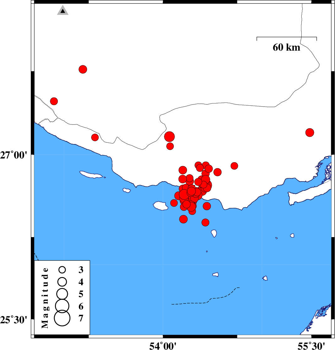 2022/06/16 00:26:04.8 04:56:04.8 26.77354.4310 ML4 Hormozgan Province, 48 km South of Bastak