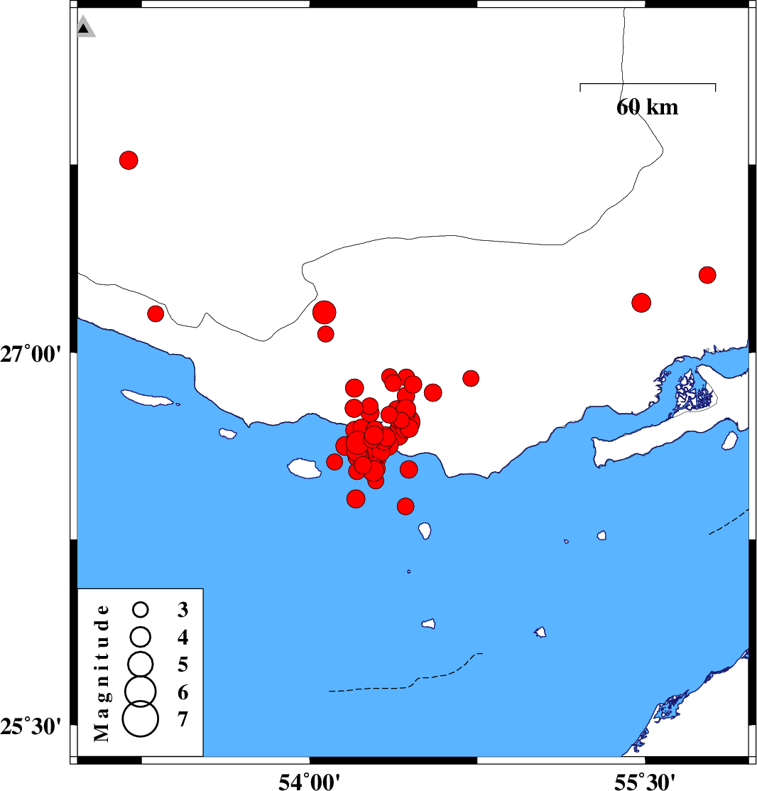 2022/06/16 00:26:04.8 04:56:04.8 26.77354.4310 ML4 Hormozgan Province, 48 km South of Bastak