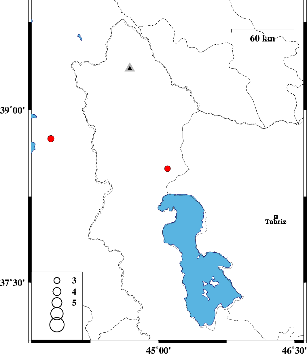 | 2023/01/11 | 17:26:07.1 | 20:56:07.1 | 38.492 | 45.099 | 12 | ML3 | Azarbaijan Gharbi Province, 15 km -East of Khoy | ||