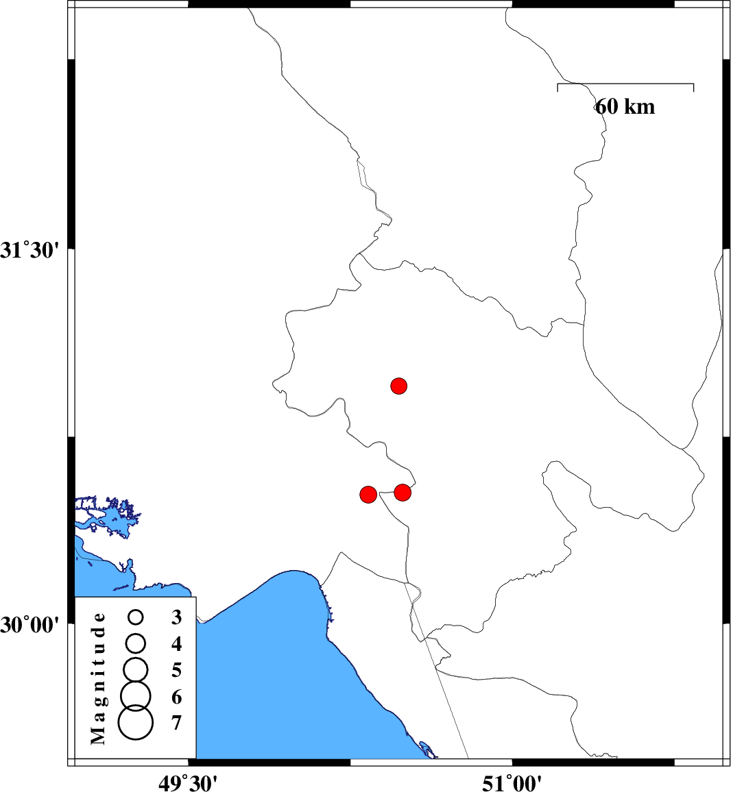 | 2023/01/14 | 01:09:33.3 | 04:39:33.3 | 30.519 | 50.333 | 19 | ML3.5 | Khoozestan Province, 12 km of Behbahan |