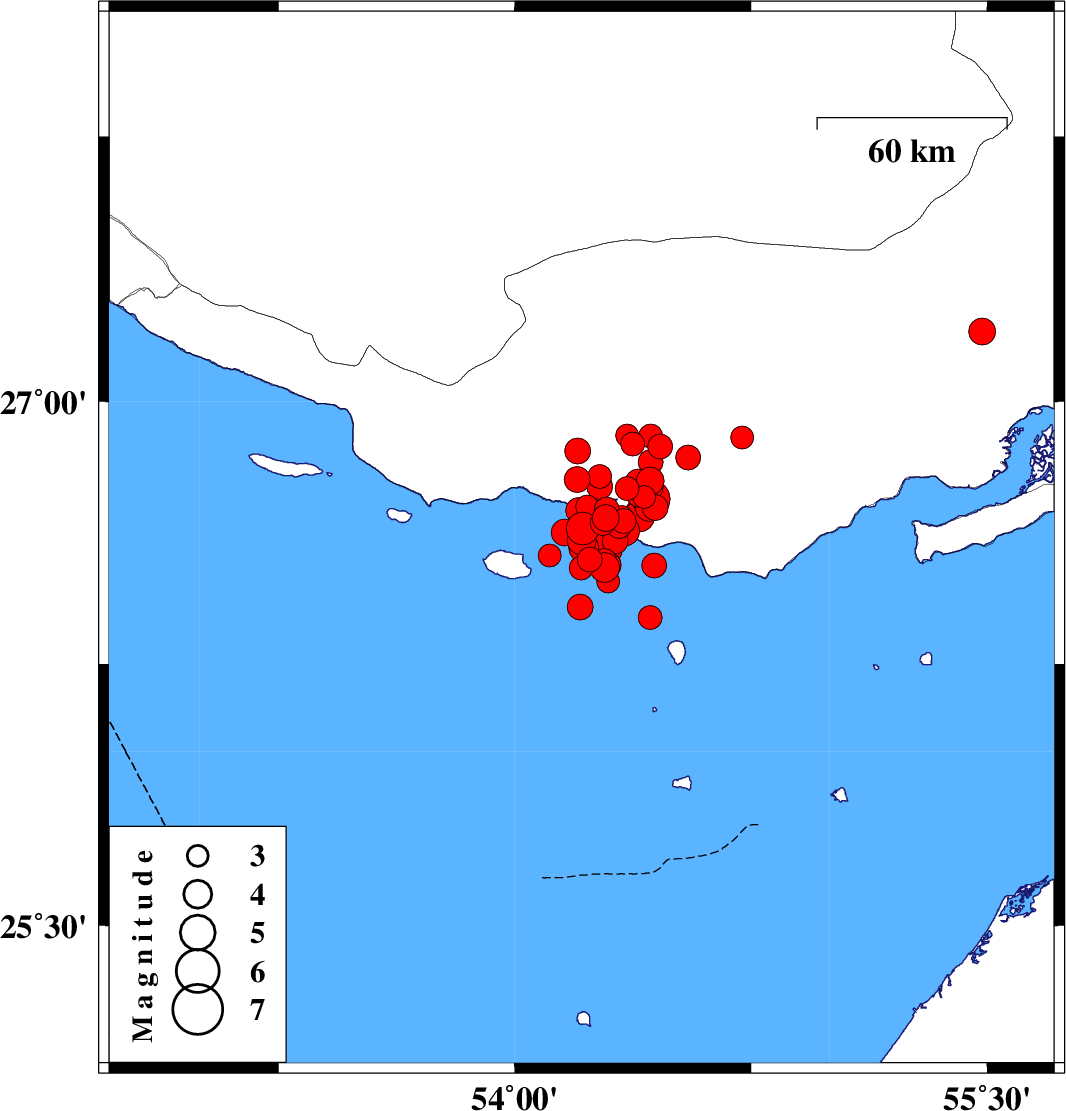 2022/06/16 00:26:04.8 04:56:04.8 26.77354.4310 ML4 Hormozgan Province, 48 km South of Bastak