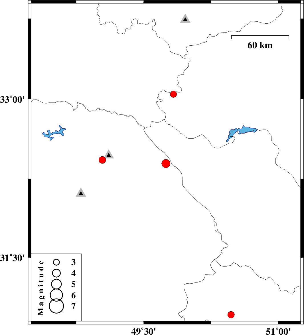 | 2023/01/30 | 17:40:26.6 | 21:10:26.6 | 33.045 | 49.833 | 10 | ML3.3 | Esfahan Province, 28 km North-West of Fereydunshahr | ||