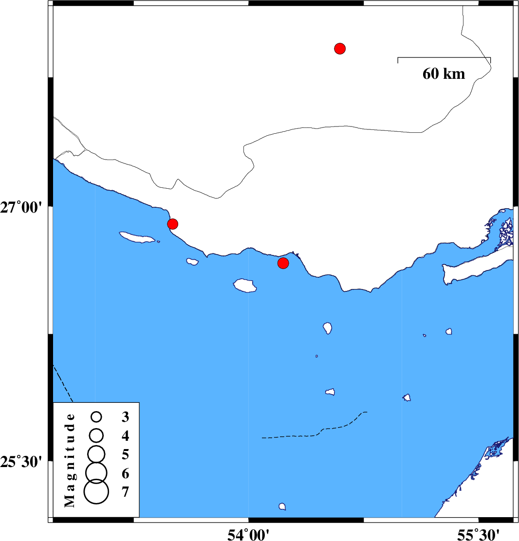 | 2023/03/29 | 16:41:17.8 | 20:11:17.8 | 26.666 | 54.225 | 12 | ML3.3 | Persian Gulf, 61 km South-West of Bastak | ||