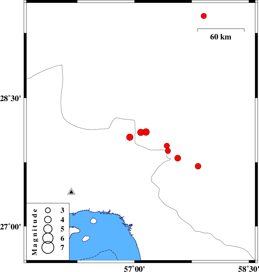 2023/03/16 09:55:37.4 13:25:37.4 27.857.56716 ML3.6 Kerman Province, 21 km South-West of Kahnuj