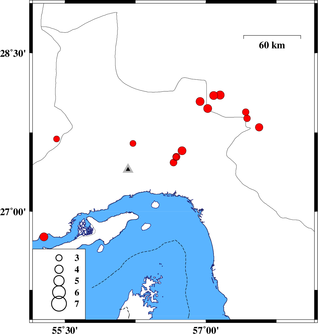2023/04/07 21:43:52.8 01:13:52.8 27.57756.74622 ML4 Hormozgan Province, 52 km North-West of Dehbarez