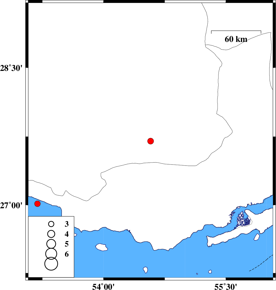 | 2023/04/11 | 21:04:06.8 | 00:34:06.8 | 27.014 | 53.189 | 12 | ML3.3 | Persian Gulf, 36 km South of Lamerd |
