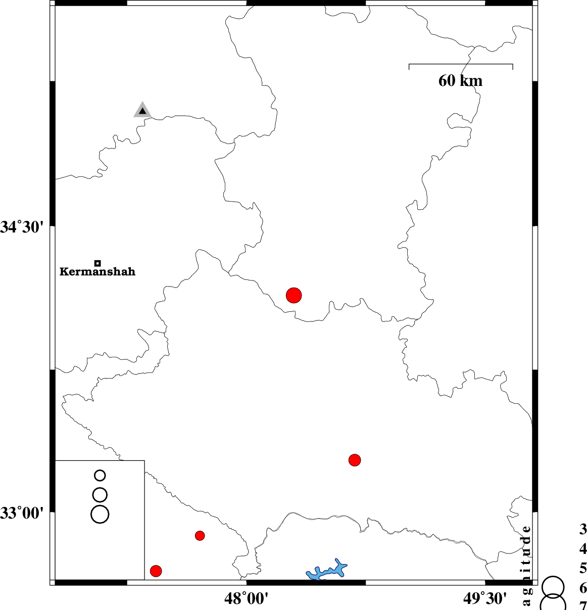 | 2023/04/20 | 11:29:22.2 | 14:59:22.2 | 32.874 | 47.706 | 12 | ML2.7 | Ilam Province, 31 km South of Pol-e dokhtar |