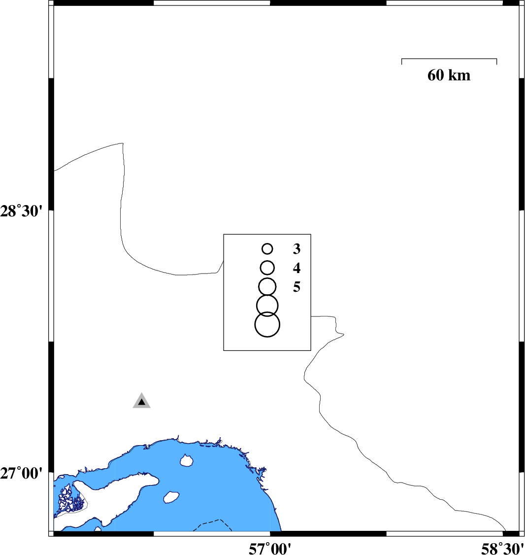 | 2023/05/14 | 01:01:29.6 | 04:31:29.6 | 28.043 | 56.744 | 12 | ML3.3 | Hormozgan Province, 94 km -West of Kahnuj |
