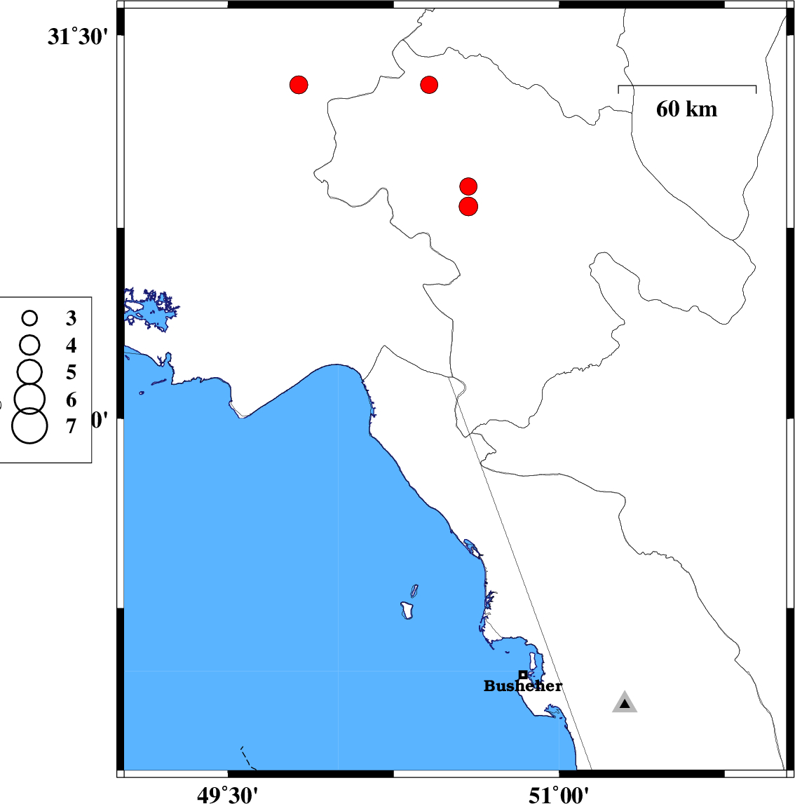 | 2023/06/05 | 09:58:49.5 | 13:28:49.5 | 29.625 | 51.299 | 16 | ML3.8 | Fars Province, 34 km -West of Kazerun |