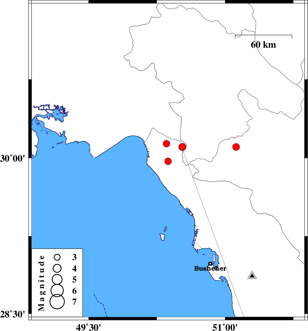 | 2023/06/17 | 17:33:40.4 | 21:03:40.4 | 29.969 | 50.373 | 12 | ML3.4 | Khoozestan Province, 46 km North-West of Bandar-e genaveh | ||