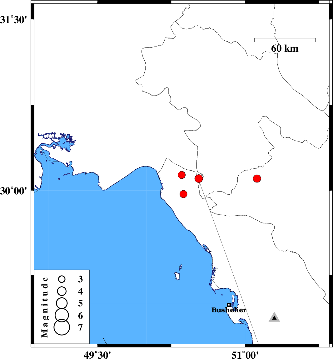 | 2023/06/17 | 17:33:40.4 | 21:03:40.4 | 29.969 | 50.373 | 12 | ML3.4 | Khoozestan Province, 46 km North-West of Bandar-e genaveh | ||