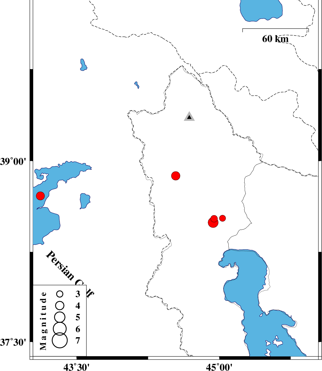 | 2023/06/19 | 10:15:38.9 | 13:45:38.9 | 38.878 | 44.541 | 10 | ML4.1 | Azarbaijan Gharbi Province, 24 km South-East of Seyah Cheshmah | ||