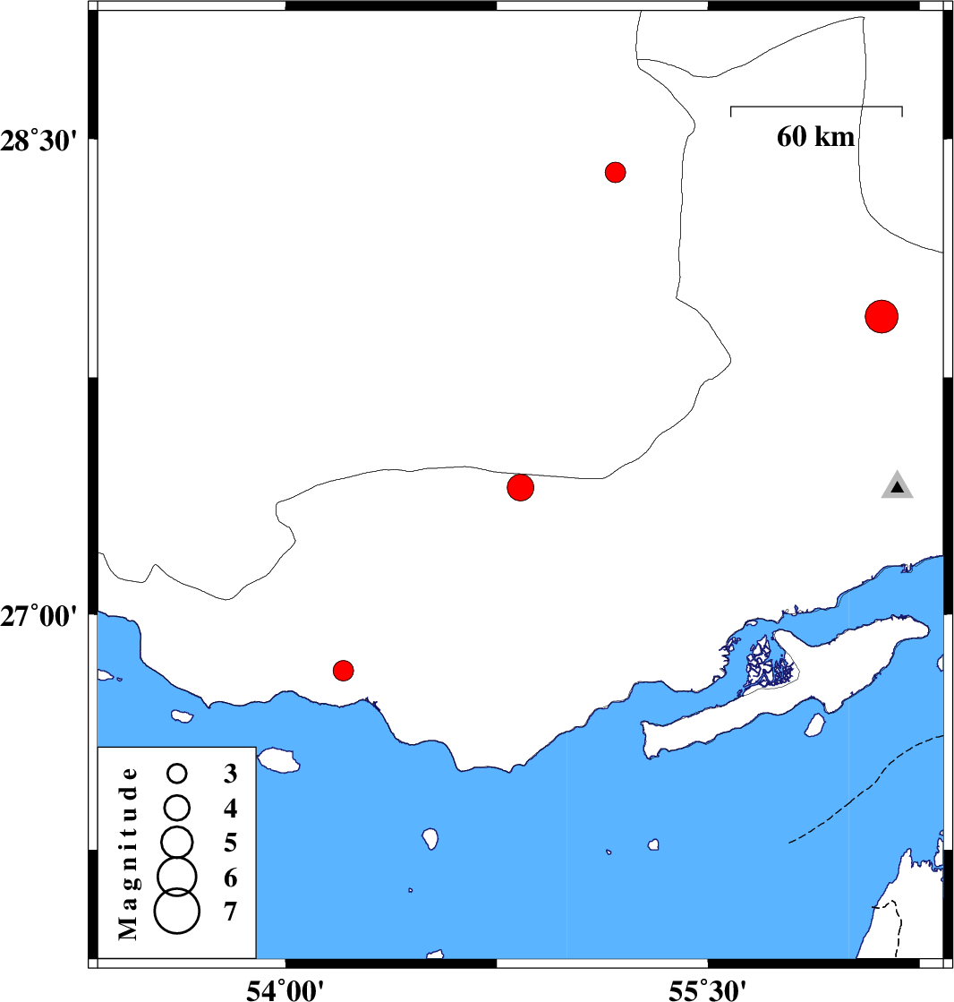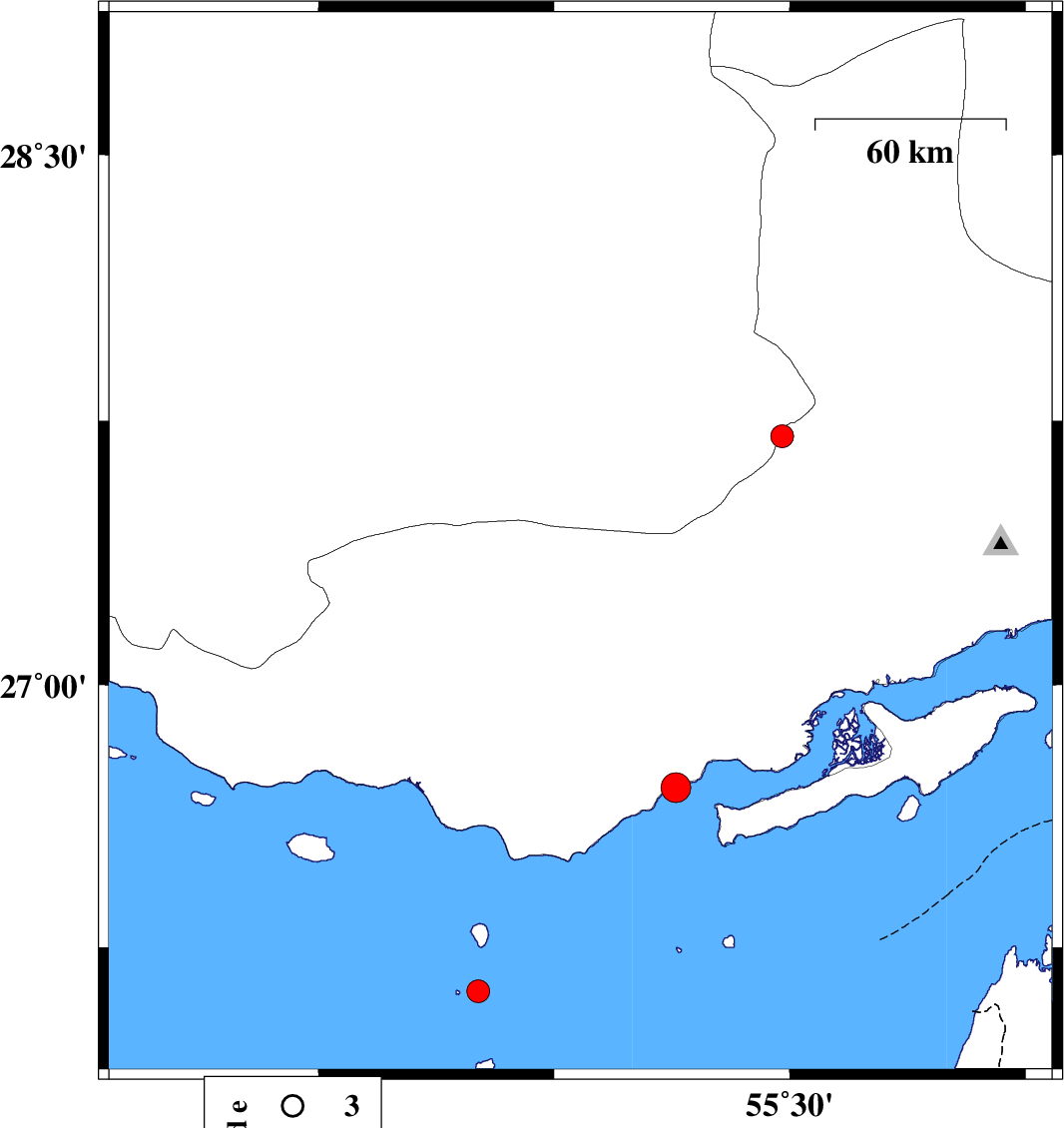 | 2023/06/22 | 12:05:08.3 | 15:35:08.3 | 26.821 | 54.205 | 12 | ML3.3 | Hormozgan Province, 45 km South-West of Bastak | ||