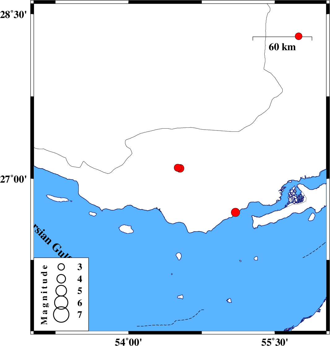 | 2023/07/04 | 02:20:08.4 | 05:50:08.4 | 27.093 | 54.528 | 12 | ML3.6 | Hormozgan Province, 20 km South-East of Bastak | ||