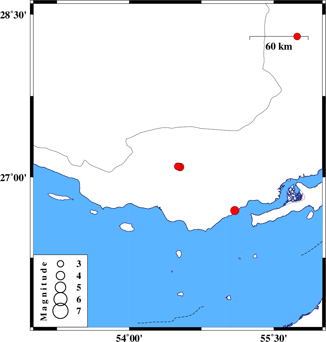 | 2023/07/04 | 02:20:08.4 | 05:50:08.4 | 27.093 | 54.528 | 12 | ML3.6 | Hormozgan Province, 20 km South-East of Bastak | ||