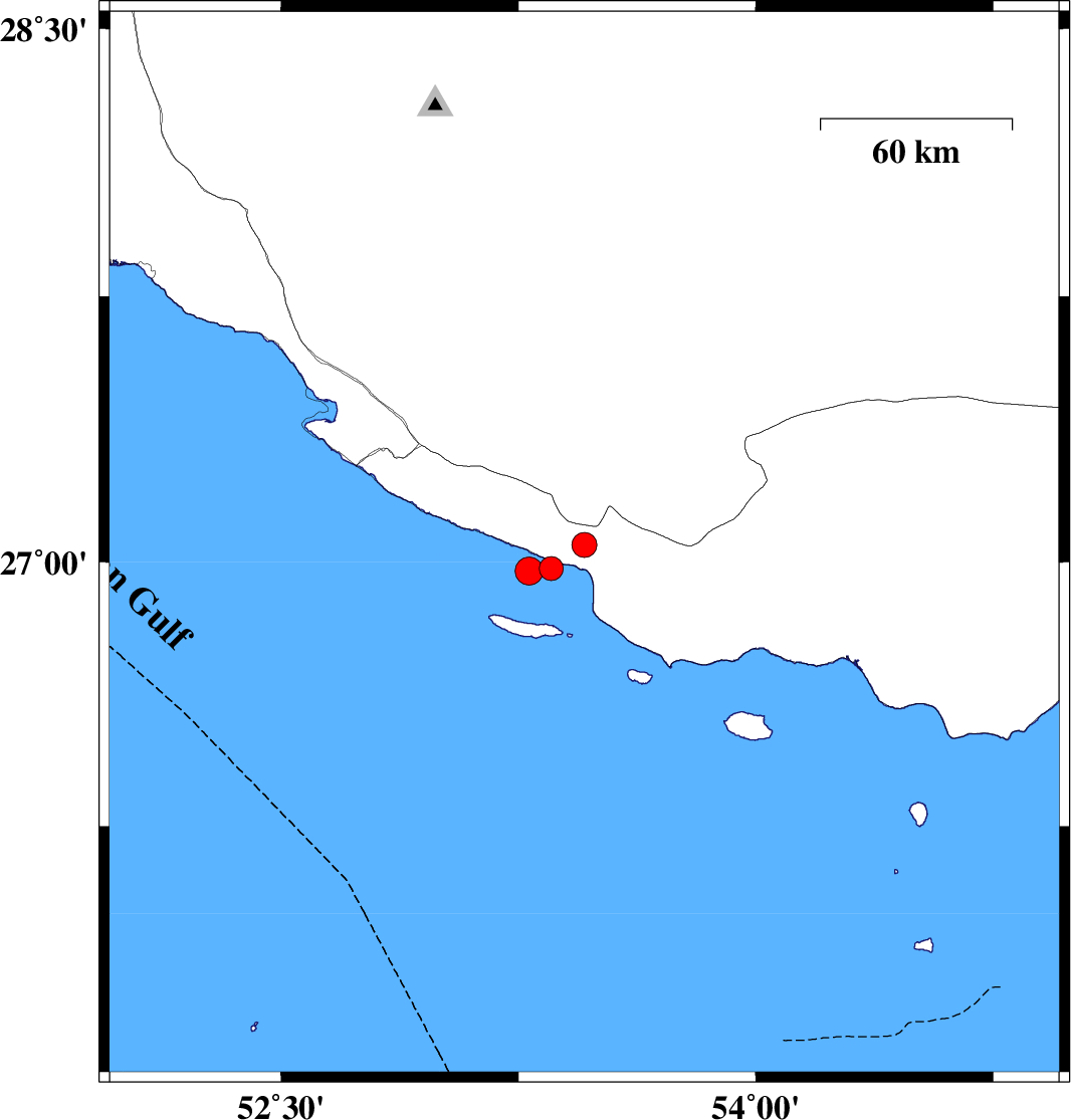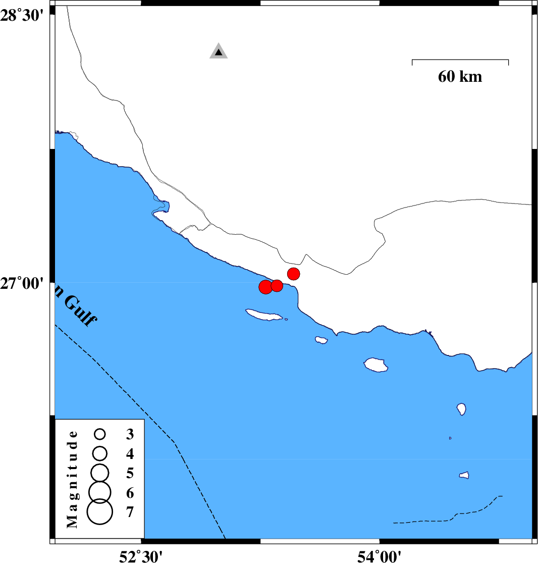| 2023/07/25 | 10:23:34.1 | 13:53:34.1 | 26.975 | 53.284 | 12 | ML3.9 | Persian Gulf, 41 km South-East of Lamerd |