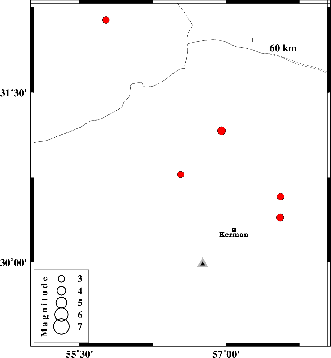 | 2023/08/30 | 02:44:37.8 | 06:14:37.8 | 30.777 | 56.534 | 7 | ML3 | Kerman Province, 5 km of Zarand | ||