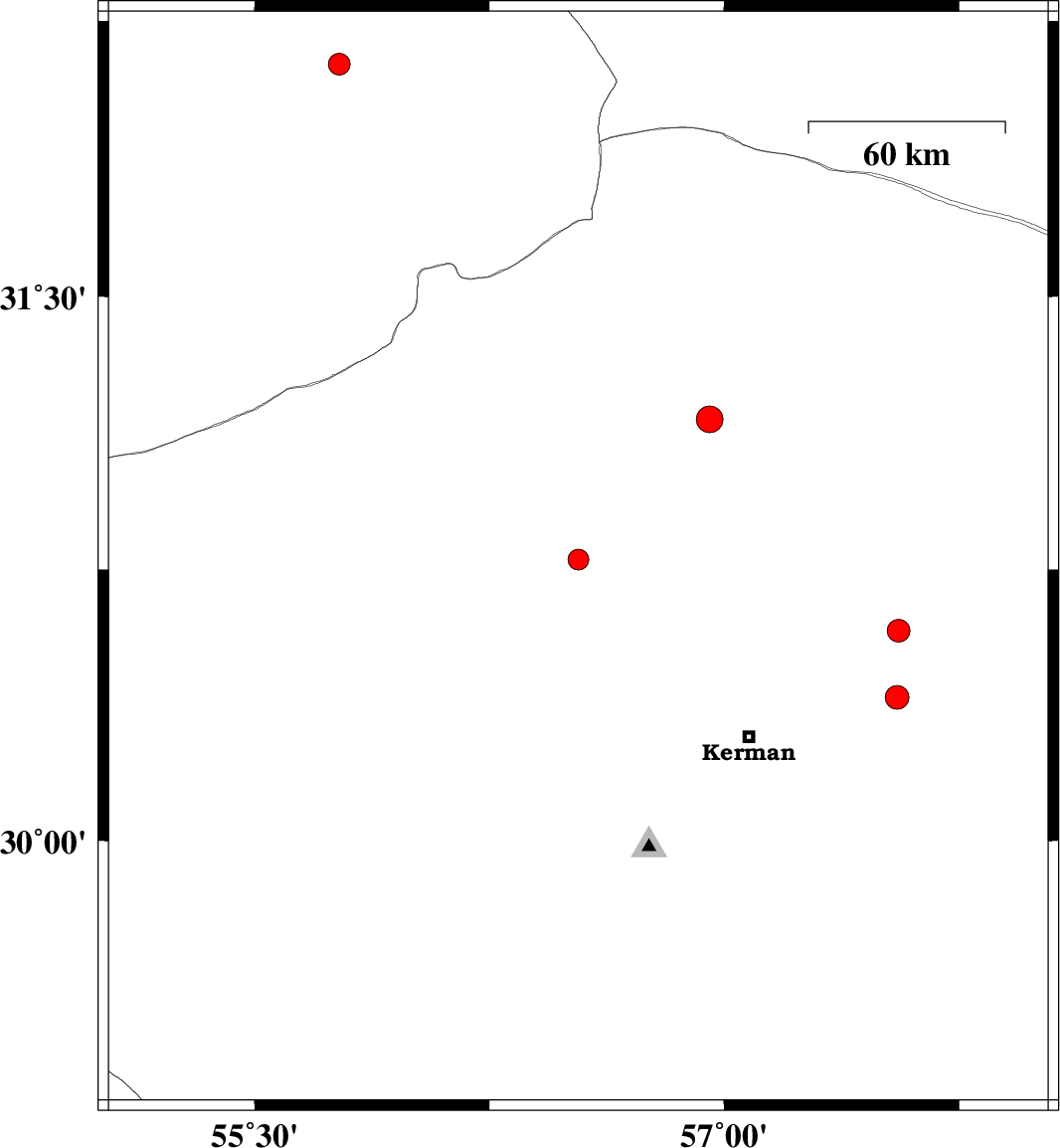| 2023/08/09 | 02:25:43.2 | 05:55:43.2 | 30.581 | 57.556 | 12 | ML3.2 | Kerman Province, 56 km North-East of Kerman | ||