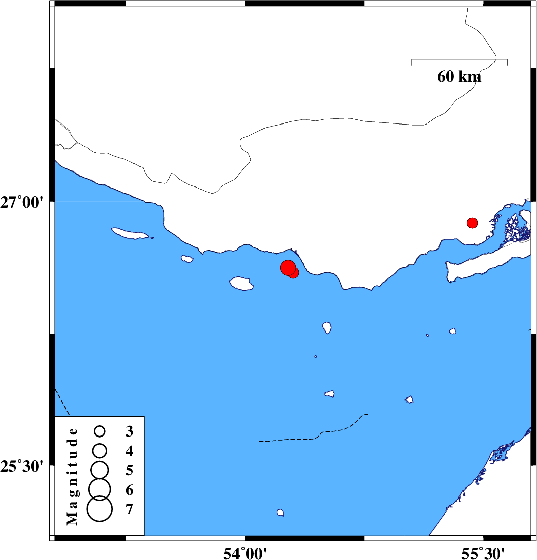 2023/09/02 01:23:43.2 04:53:43.2 26.59854.310 ML3.2 Persian Gulf, 55 km -West of Bandar-e lengeh