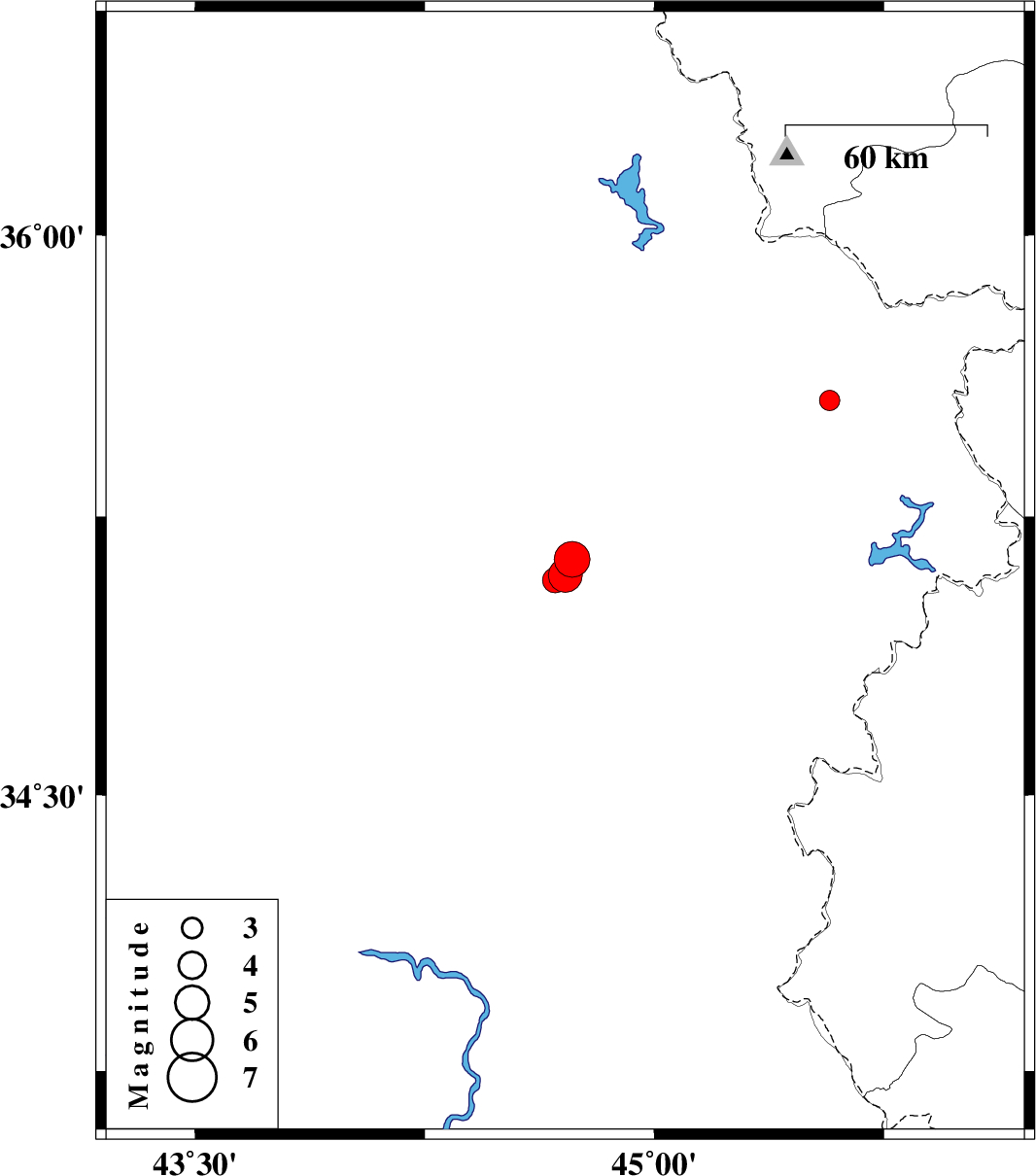| 2023/09/10 | 21:42:48.7 | 01:12:48.7 | 35.092 | 44.709 | 12 | ML5 | Iraq, 84 km South-West of Sulaymaniyah | ||