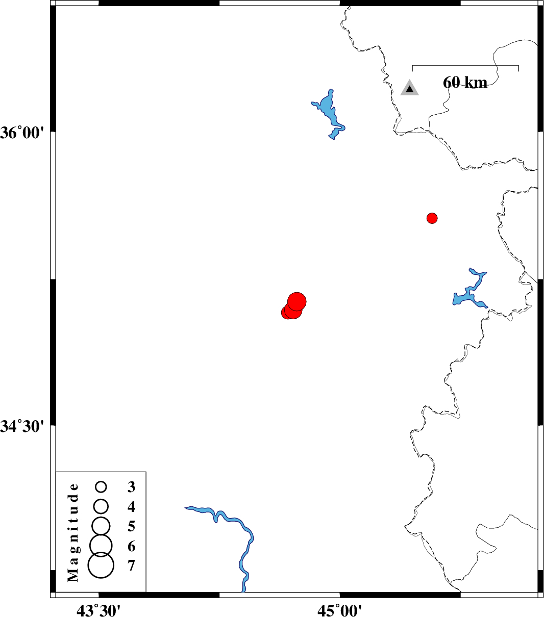 | 2023/09/10 | 21:43:51.3 | 01:13:51.3 | 35.135 | 44.731 | 12 | ML5.2 | Iraq, 80 km South-West of Sulaymaniyah | ||