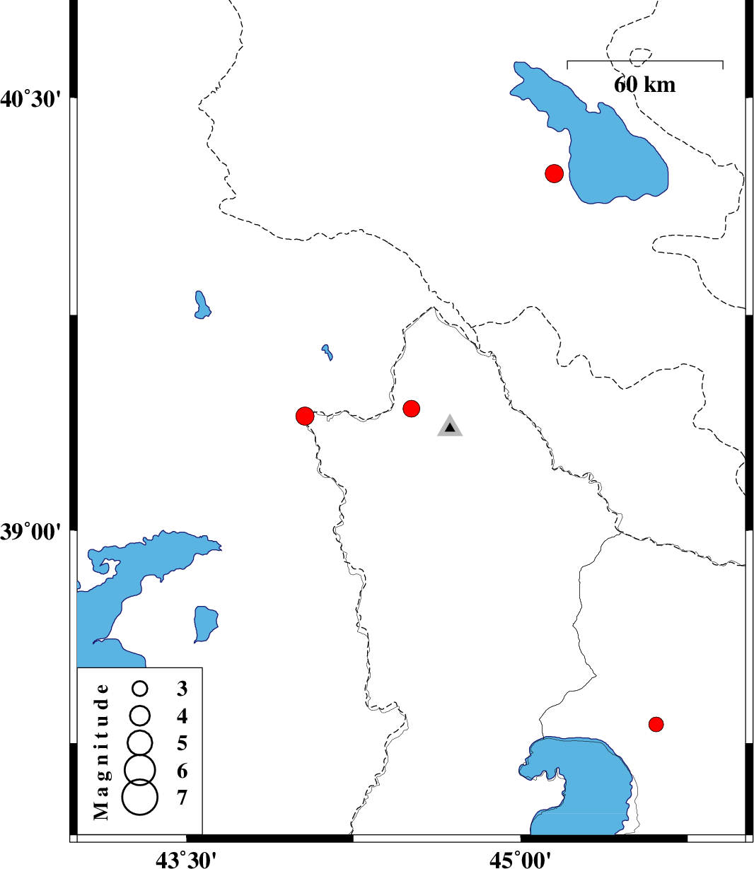 | 2023/08/21 | 09:59:58.6 | 13:29:58.6 | 40.238 | 45.151 | 10 | ML3.6 | Armenia, 55 km -East of Yerevan |