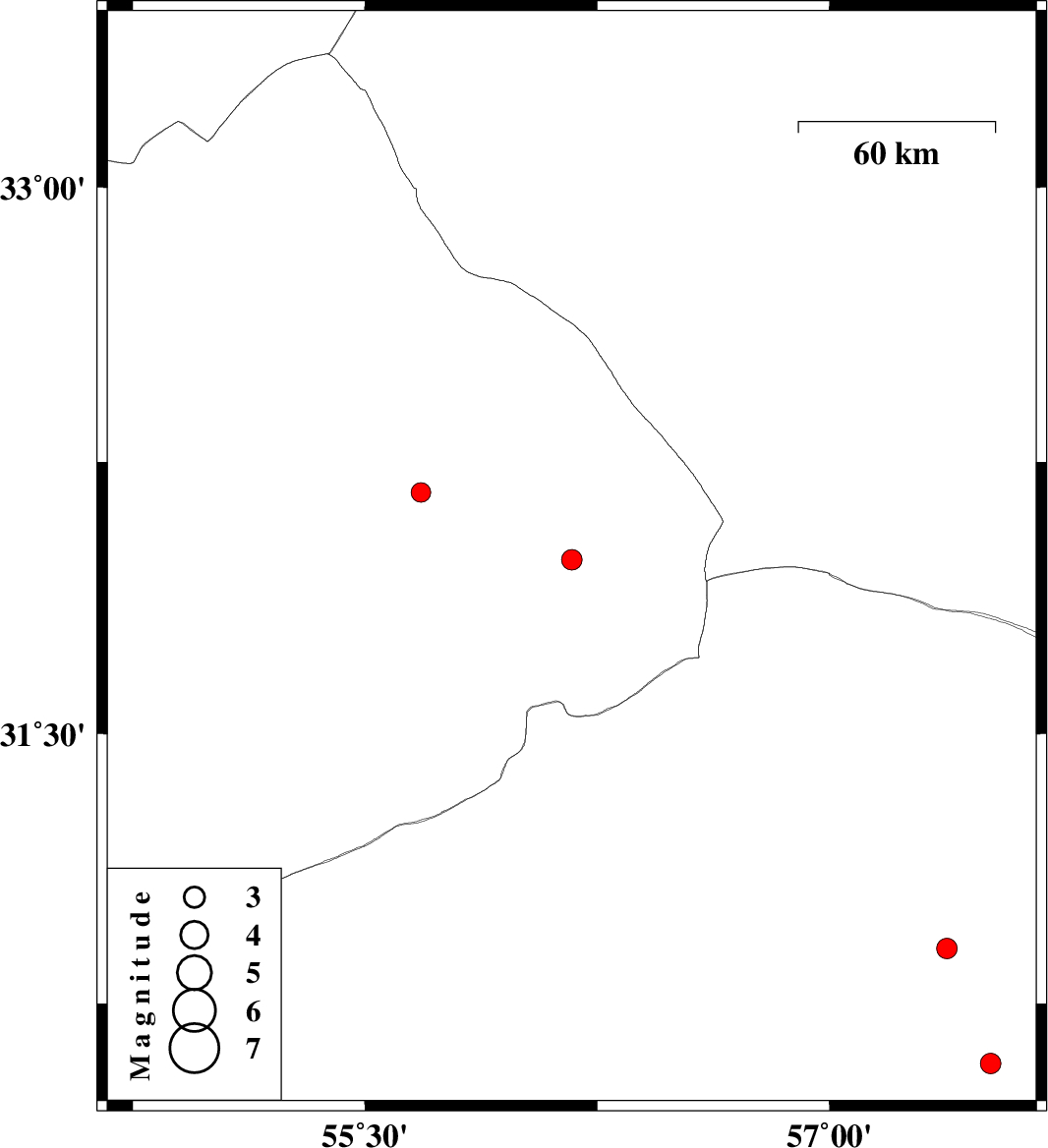 | 2023/09/21 | 17:08:10.9 | 20:38:10.9 | 30.583 | 57.521 | 12 | ML3 | Kerman Province, 54 km North-East of Kerman |