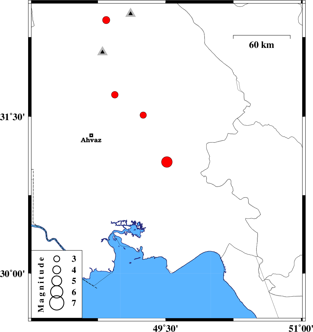| 2023/10/11 | 06:48:37.1 | 10:18:37.1 | 31.707 | 48.938 | 12 | ML3.4 | Khoozestan Province, 38 km South of Shushtar | ||