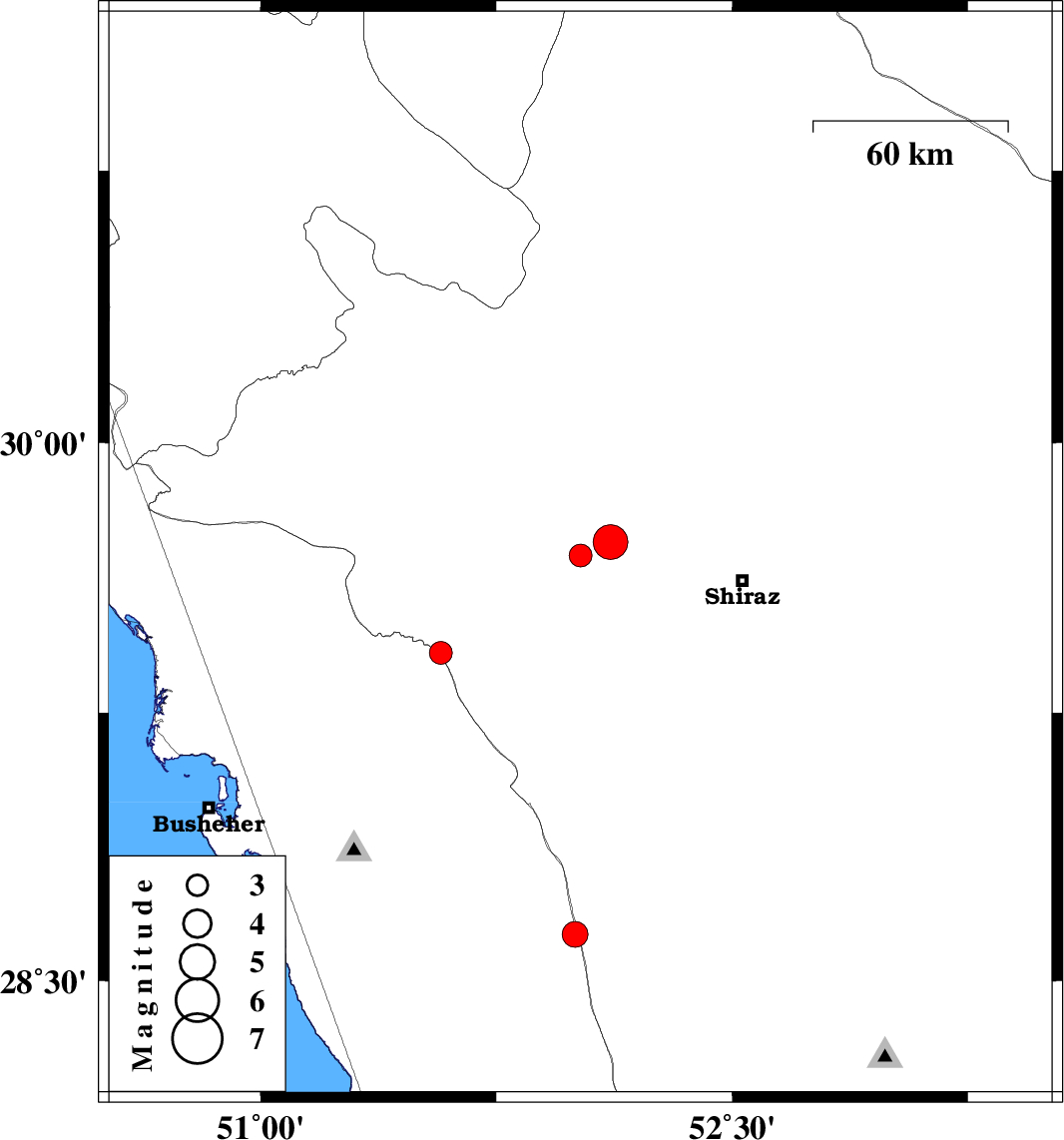| 2023/10/16 | 13:56:11.9 | 17:26:11.9 | 28.63 | 52.001 | 16 | ML3.6 | Bushehr Province, 28 km South of Farashband |