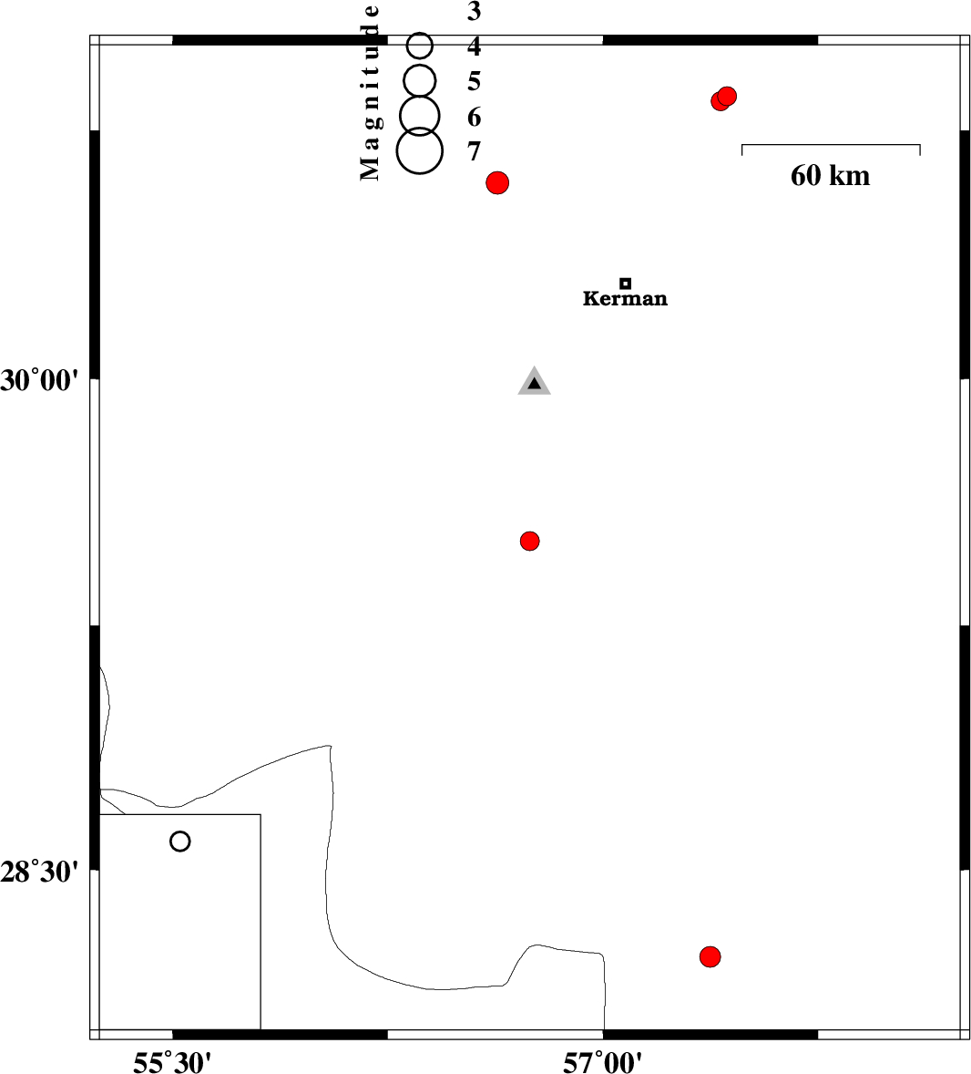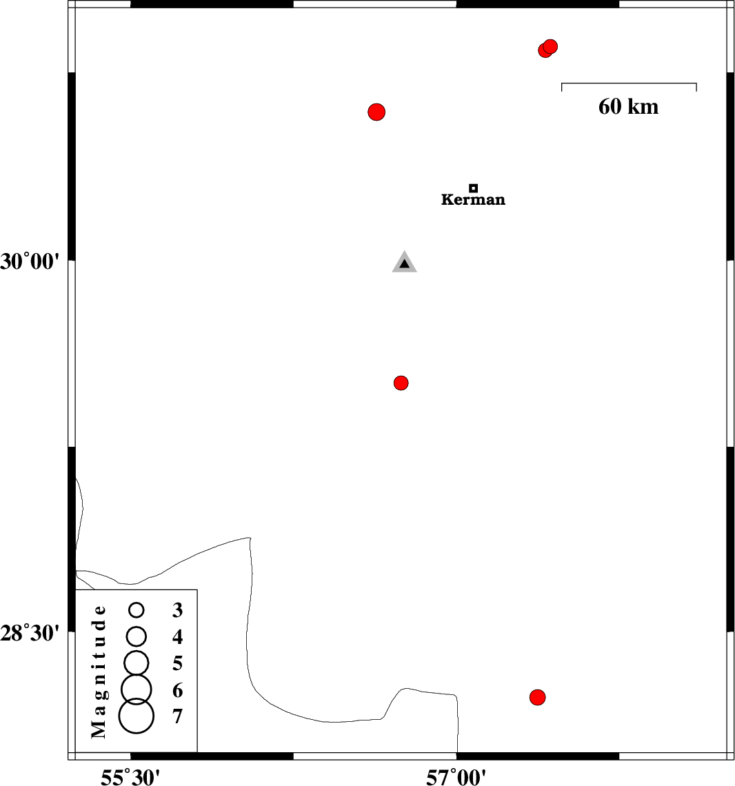 | 2023/10/16 | 02:08:25.4 | 05:38:25.4 | 30.837 | 57.41 | 12 | ML3 | Kerman Province, 80 km -East of Zarand |