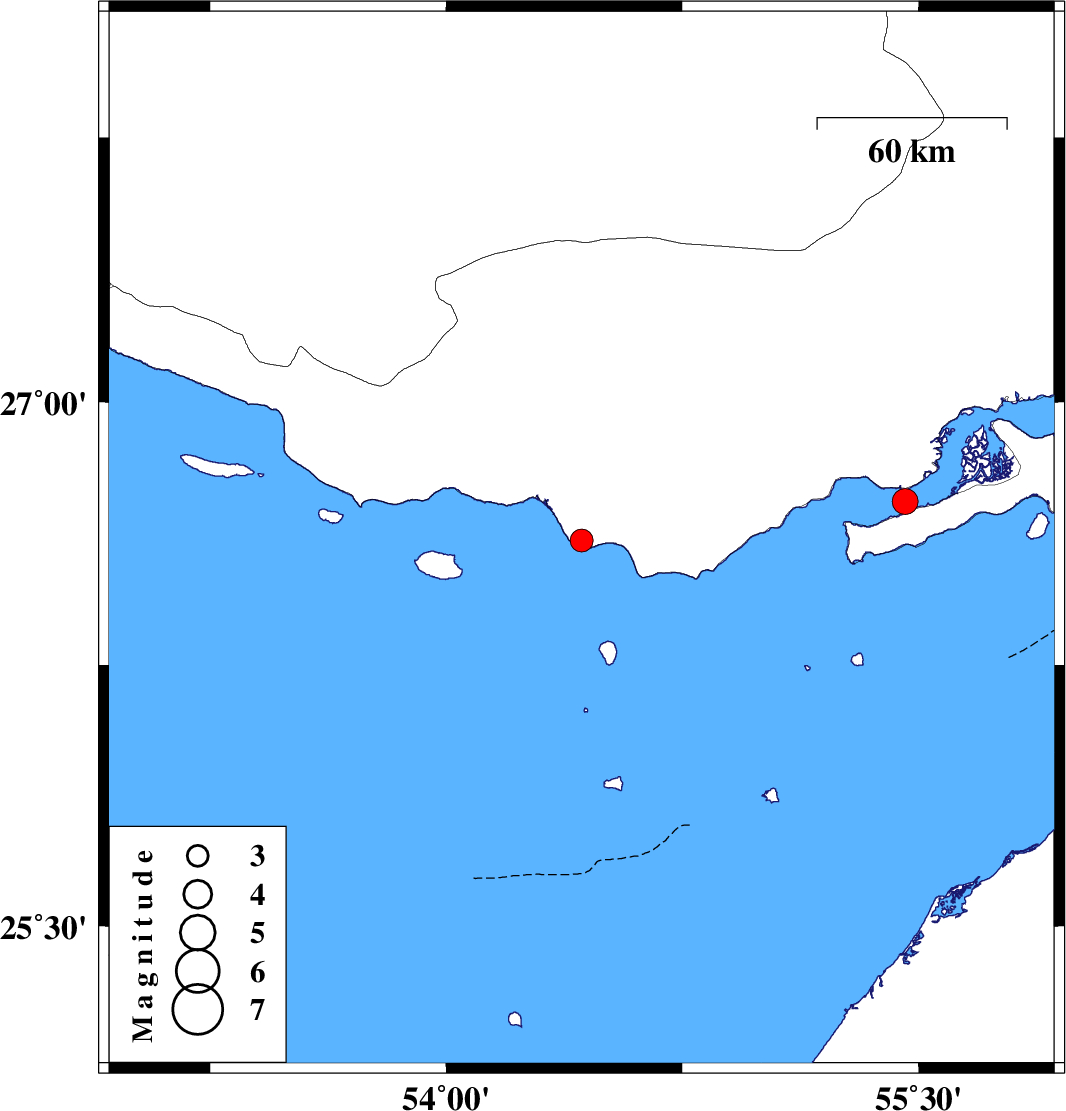 | 2023/10/23 | 10:58:23.8 | 14:28:23.8 | 26.717 | 55.458 | 25 | ML3.6 | Persian Gulf, 64 km North-East of Bandar-e lengeh |