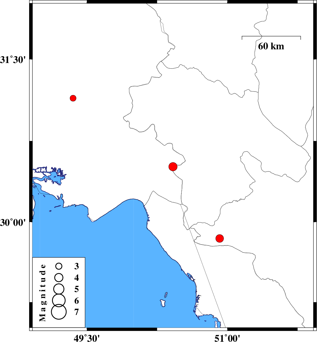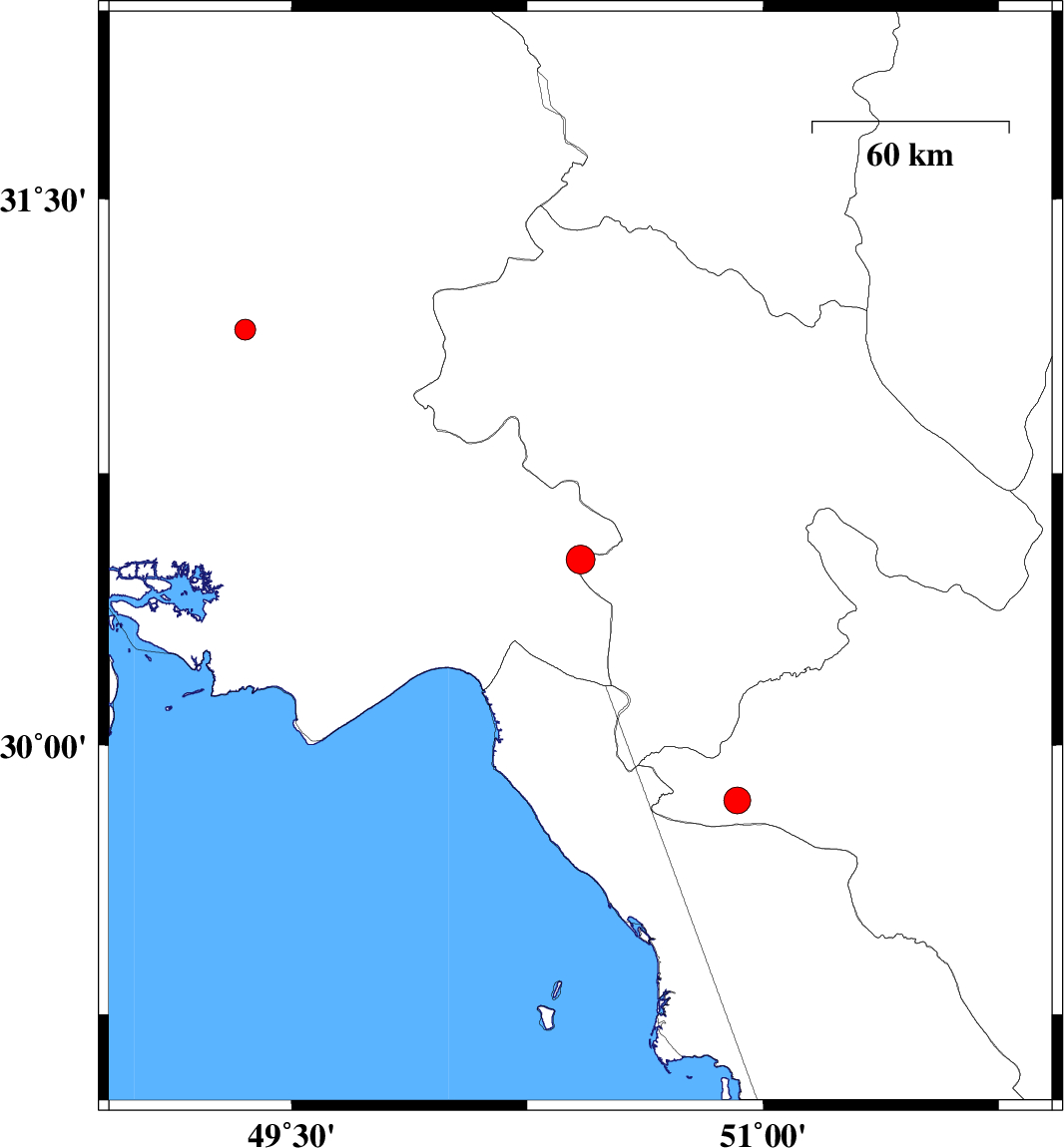 | 2023/10/22 | 20:08:56.1 | 23:38:56.1 | 29.846 | 50.918 | 12 | ML3.8 | Fars Province, 58 km South-East of Dogonbadan |