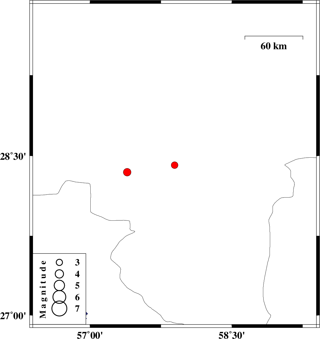| 2023/10/30 | 16:09:30.1 | 19:39:30.1 | 28.346 | 57.394 | 12 | ML3.7 | Kerman Province, 49 km South-West of Jiroft |