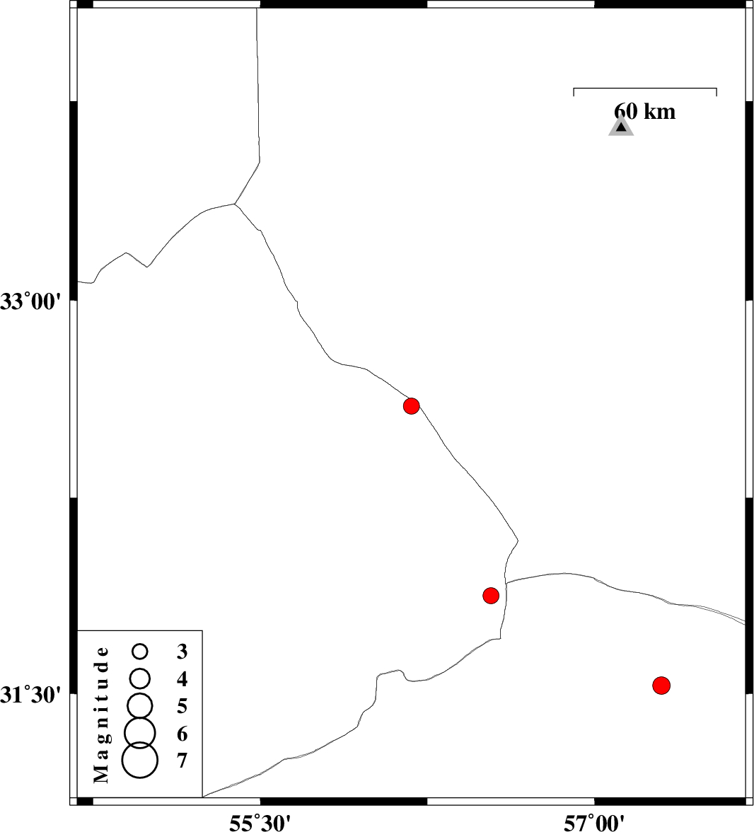| 2023/11/08 | 10:35:52.6 | 14:05:52.6 | 32.599 | 56.178 | 12 | ML3.3 | Yazd Province, 131 km South-West of Tabas | ||