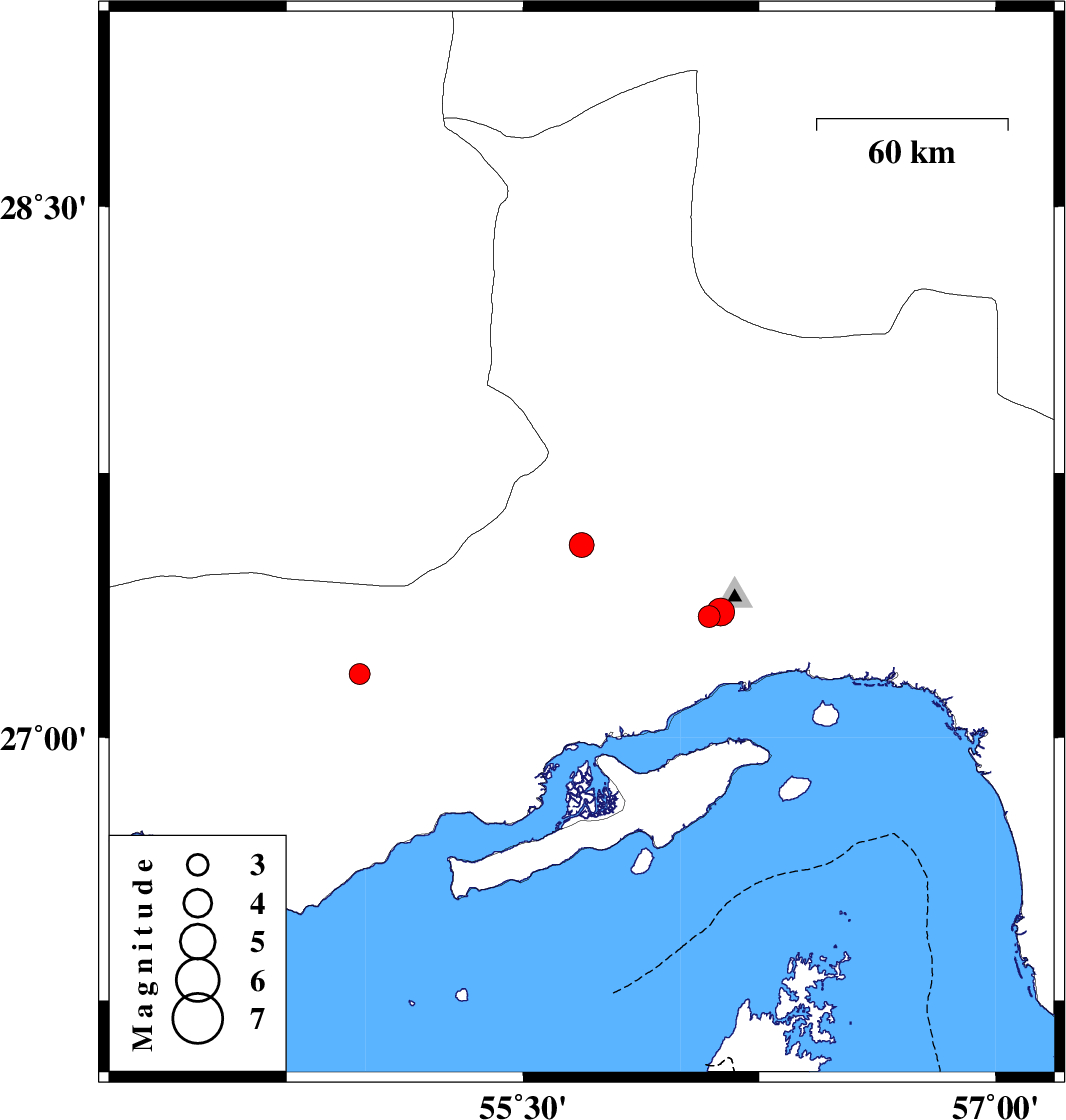 | 2021/03/20 | 00:36:08.3 | 04:06:08.3 | 27.357 | 56.127 | 6 | ML3.9 | Hormozgan Province, 25 km North-West of Bandar-e abbas |