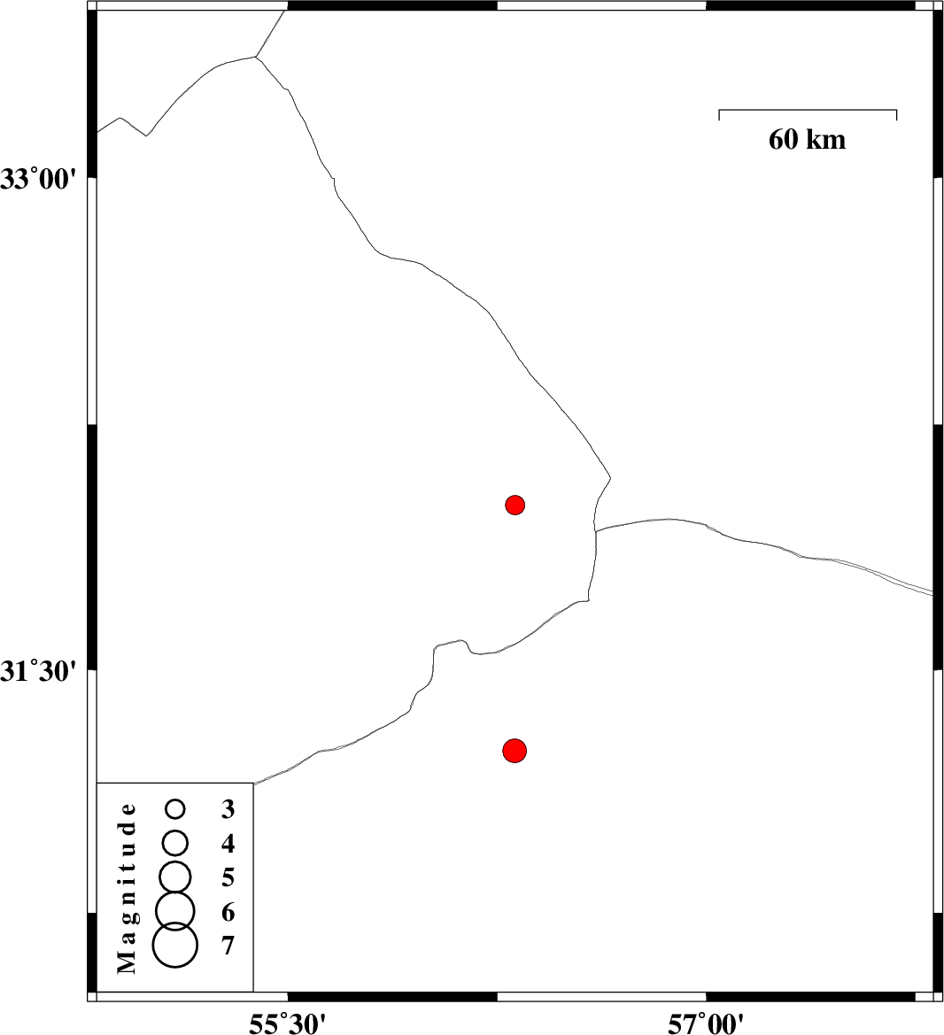| 2023/11/22 | 02:11:43.2 | 05:41:43.2 | 31.25 | 56.312 | 12 | ML3.8 | Kerman Province, 48 km -West of Ravar |