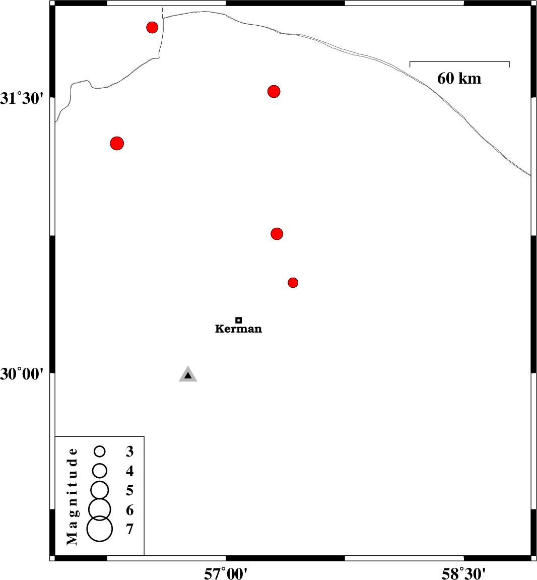 | 2023/11/18 | 07:32:14.5 | 11:02:14.5 | 30.76 | 57.321 | 12 | ML3.4 | Kerman Province, 57 km North-East of Kerman | ||
