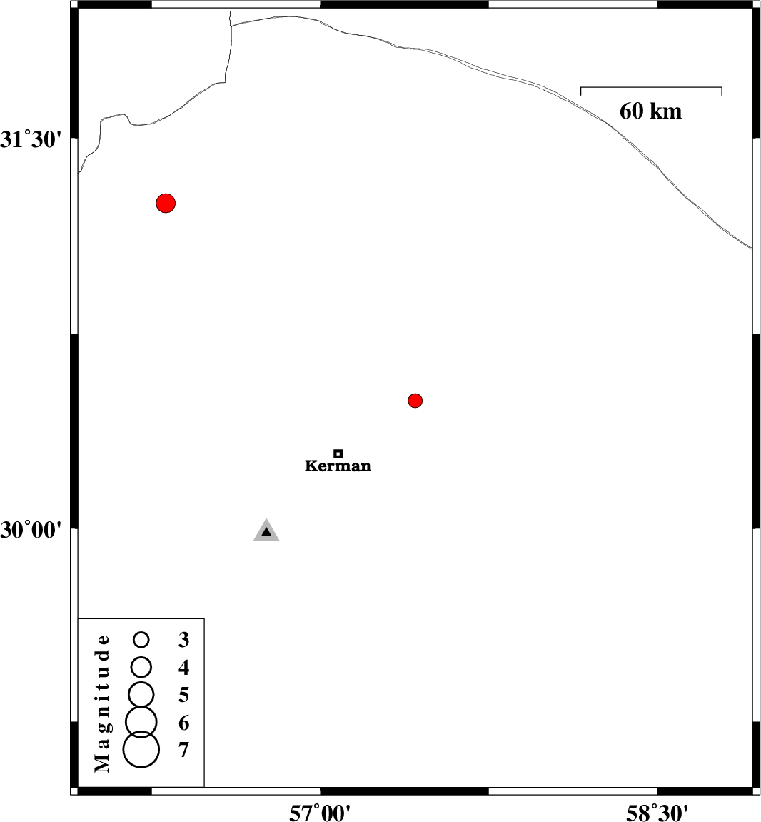 | 2023/11/22 | 02:11:43.2 | 05:41:43.2 | 31.25 | 56.312 | 12 | ML3.8 | Kerman Province, 48 km -West of Ravar |