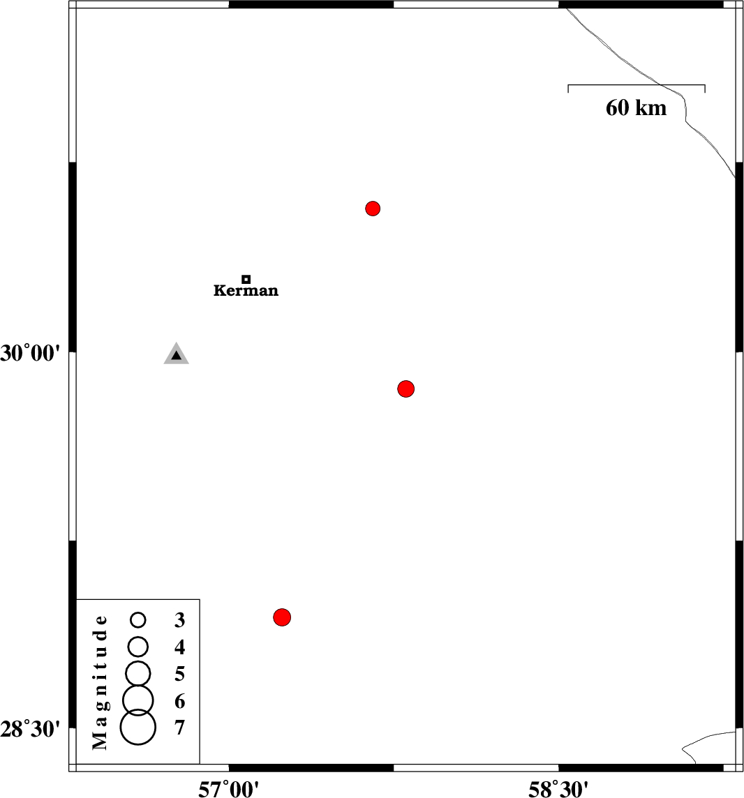 | 2023/12/23 | 16:37:57.9 | 20:07:57.9 | 30.567 | 57.655 | 10 | ML3 | Kerman Province, 63 km North-East of Kerman |