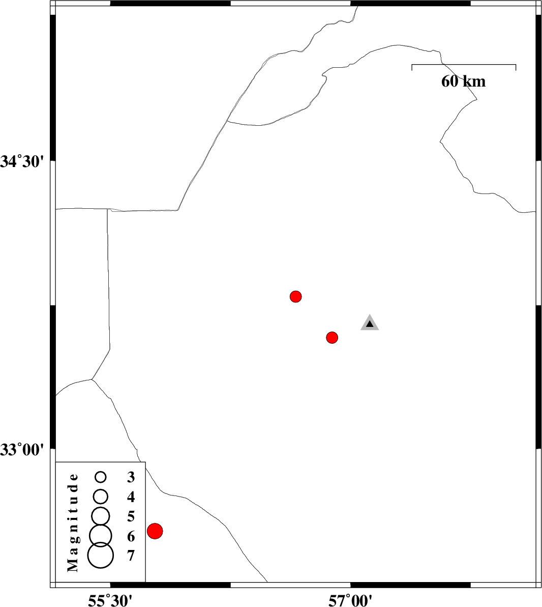 | 2024/01/08 | 19:33:40.8 | 23:03:40.8 | 32.566 | 55.778 | 12 | ML4.4 | Yazd Province, 113 km North-East of Bafq | ||