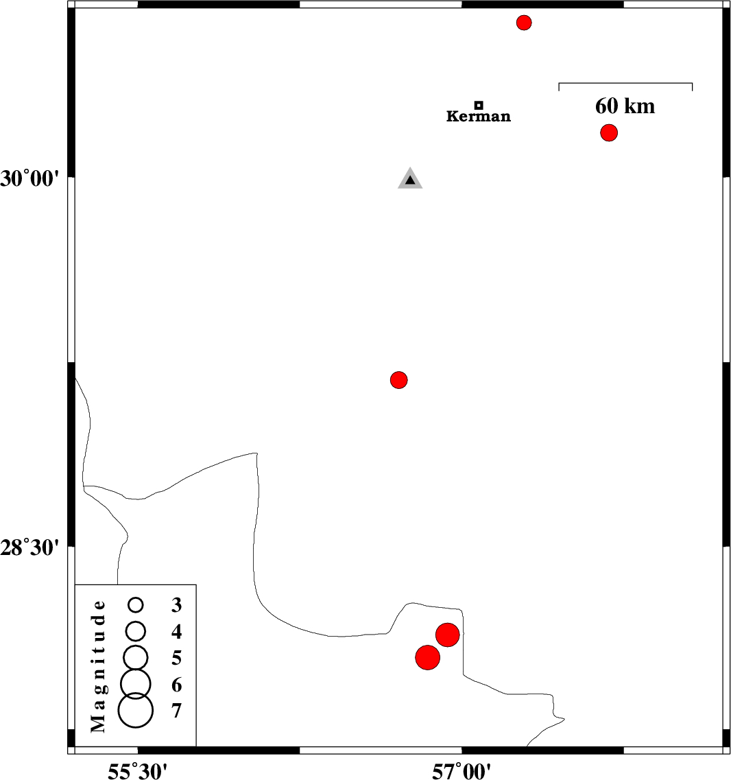 | 2021/03/11 | 09:19:29.8 | 12:49:29.8 | 30.177 | 57.681 | 12 | ML3.5 | Kerman Province, 59 km South-East of Kerman |
