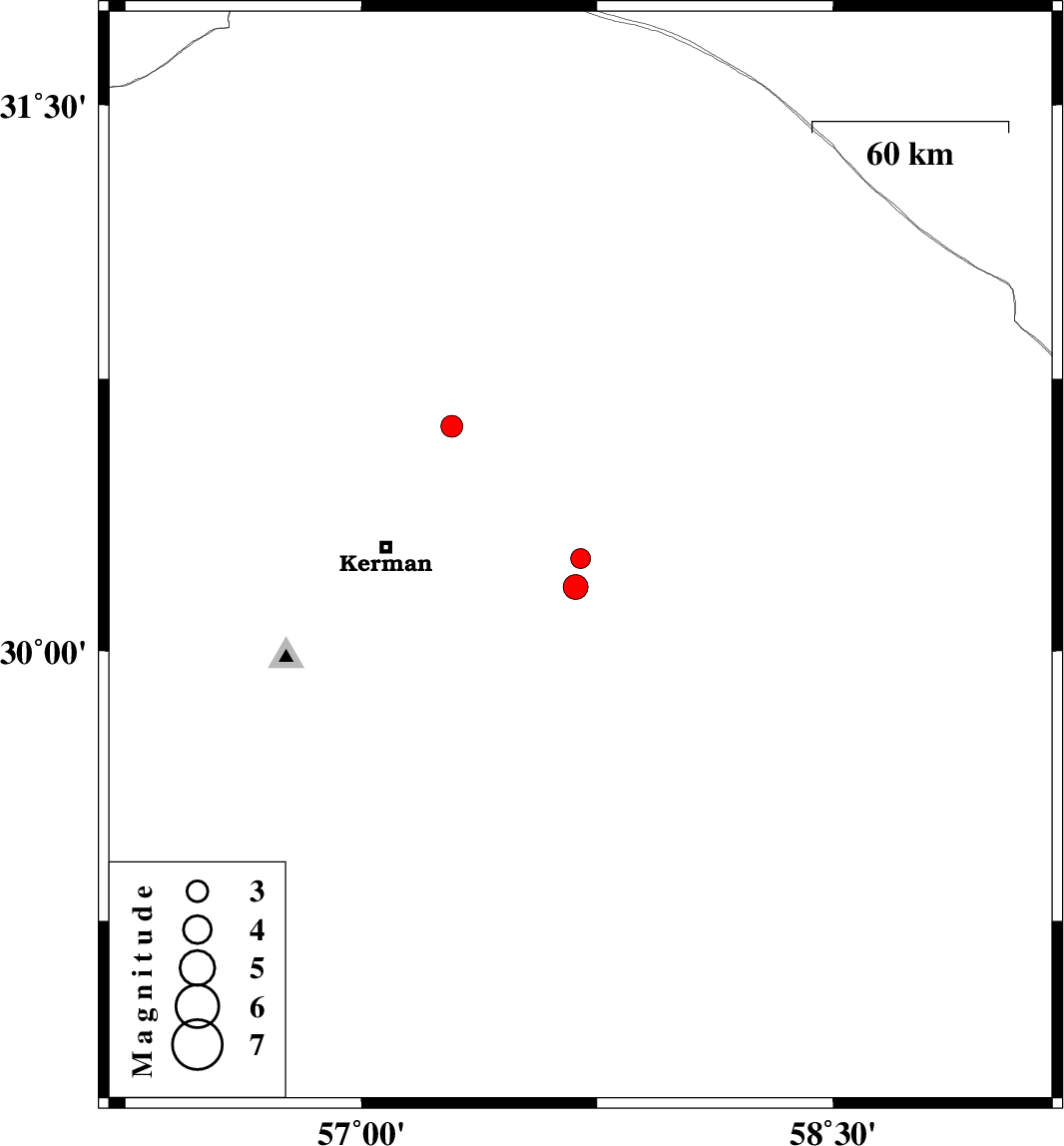 | 2021/03/11 | 09:19:29.8 | 12:49:29.8 | 30.177 | 57.681 | 12 | ML3.5 | Kerman Province, 59 km South-East of Kerman |