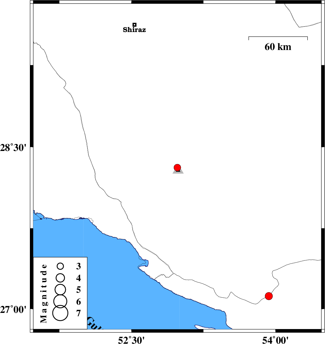| 2021/03/11 | 07:51:54.2 | 11:21:54.2 | 27.12 | 53.93 | 12 | ML3.5 | Hormozgan Province, 44 km -West of Bastak |